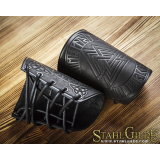 This leather cuff bracers are embossed with Valcnut knotwork design.